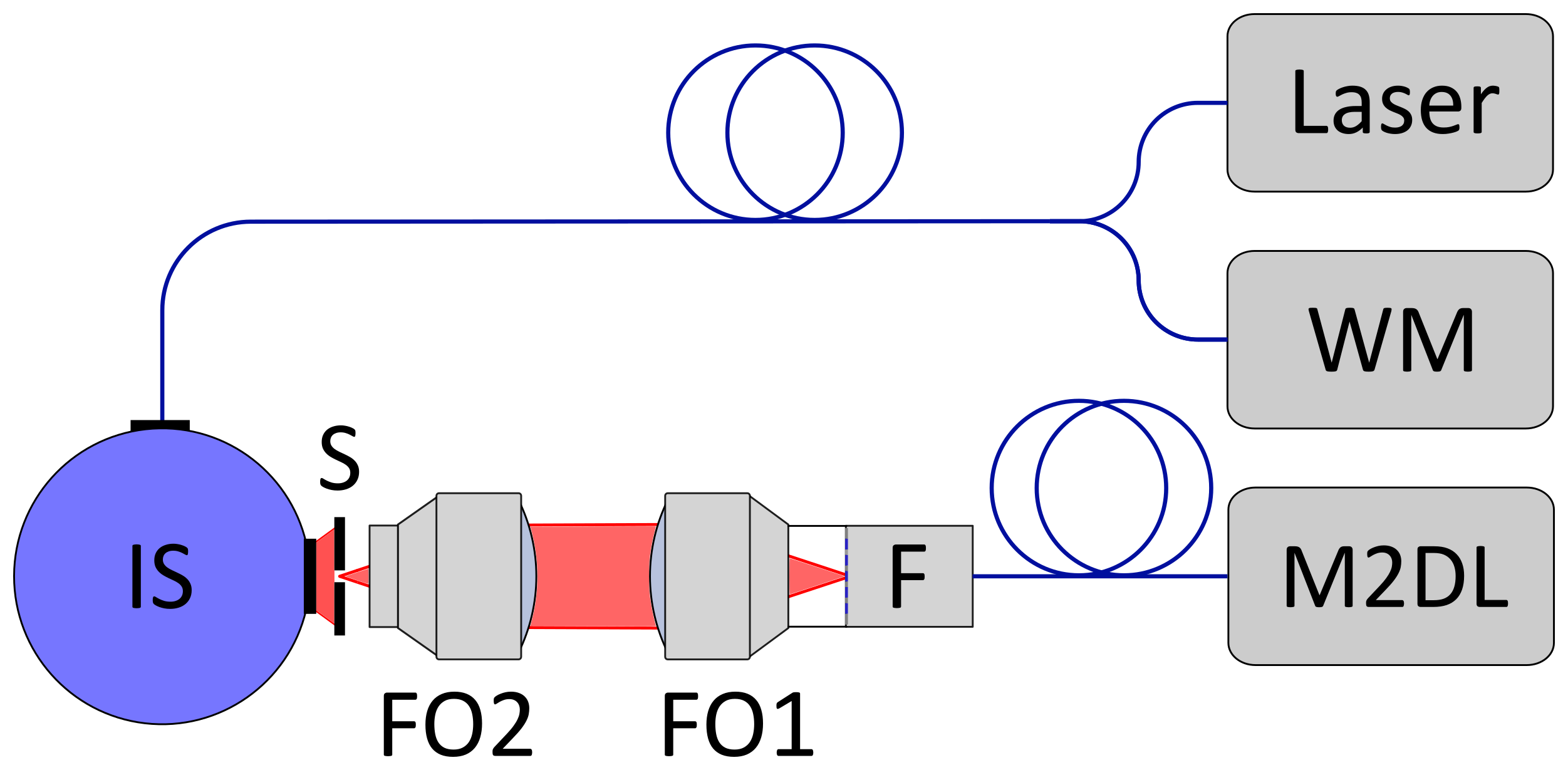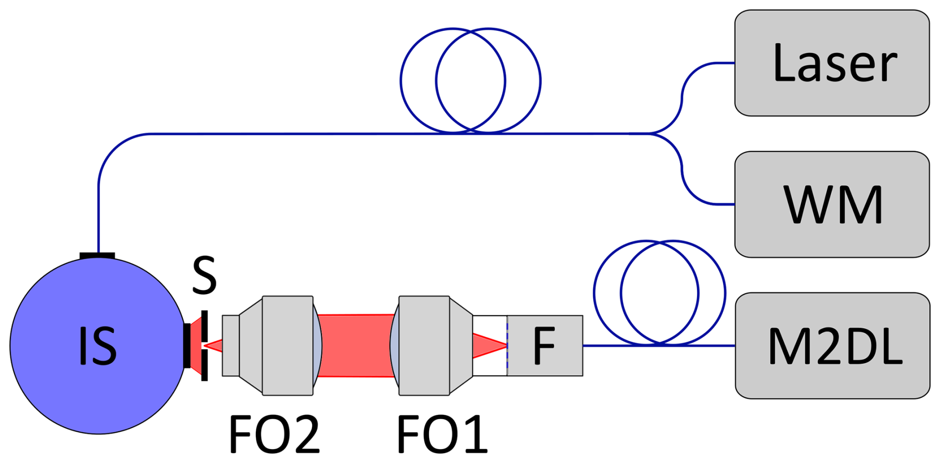 Figure 4Optical setup for stray light measurements. A tunable Littman/Metcalf laser emits laser light, which is fed into a Wavemeter (WM) and an integrating sphere (IS) via a y-fiber. At the output port of the sphere, a coated adjustable slit aperture (S) is assembled, which is imaged with two objectives (FO1 and FO2) on a single fiber of the input fiber bundle ferrule (F) of MAMAP2D-Light (M2DL).