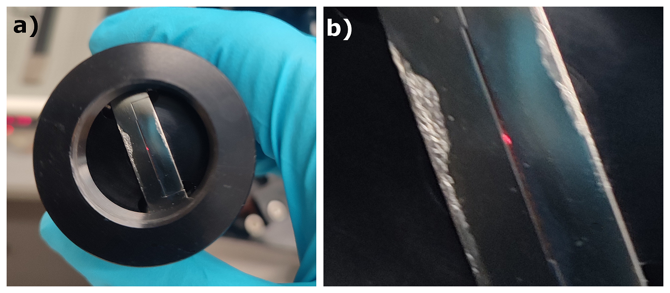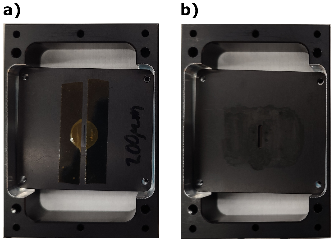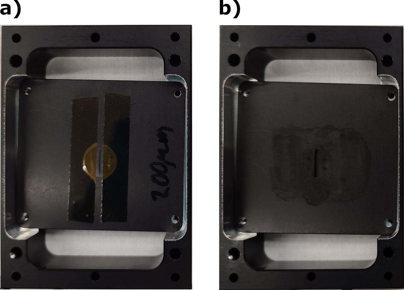 Figure 3Uncoated adjustable slit aperture as mounted during the CoMet 2.0 mission at the entrance fiber ferrule (Ferrule 2, in Fig. 1) of the spectrometer. (a) Side of uncoated adjustable slit aperture showing in direction of the ferrule. (b) Side of uncoated adjustable slit aperture showing in direction of the collimator lens.