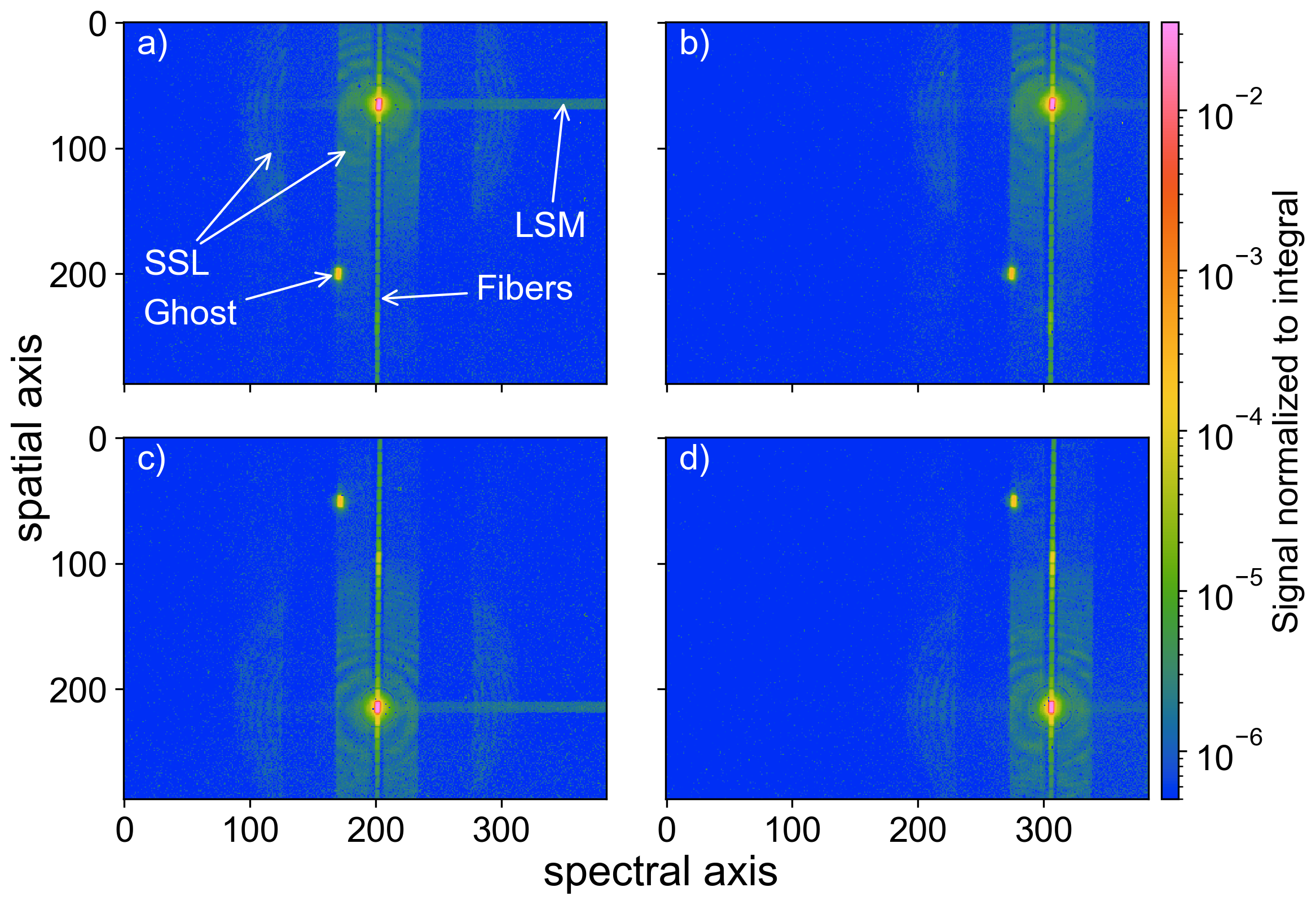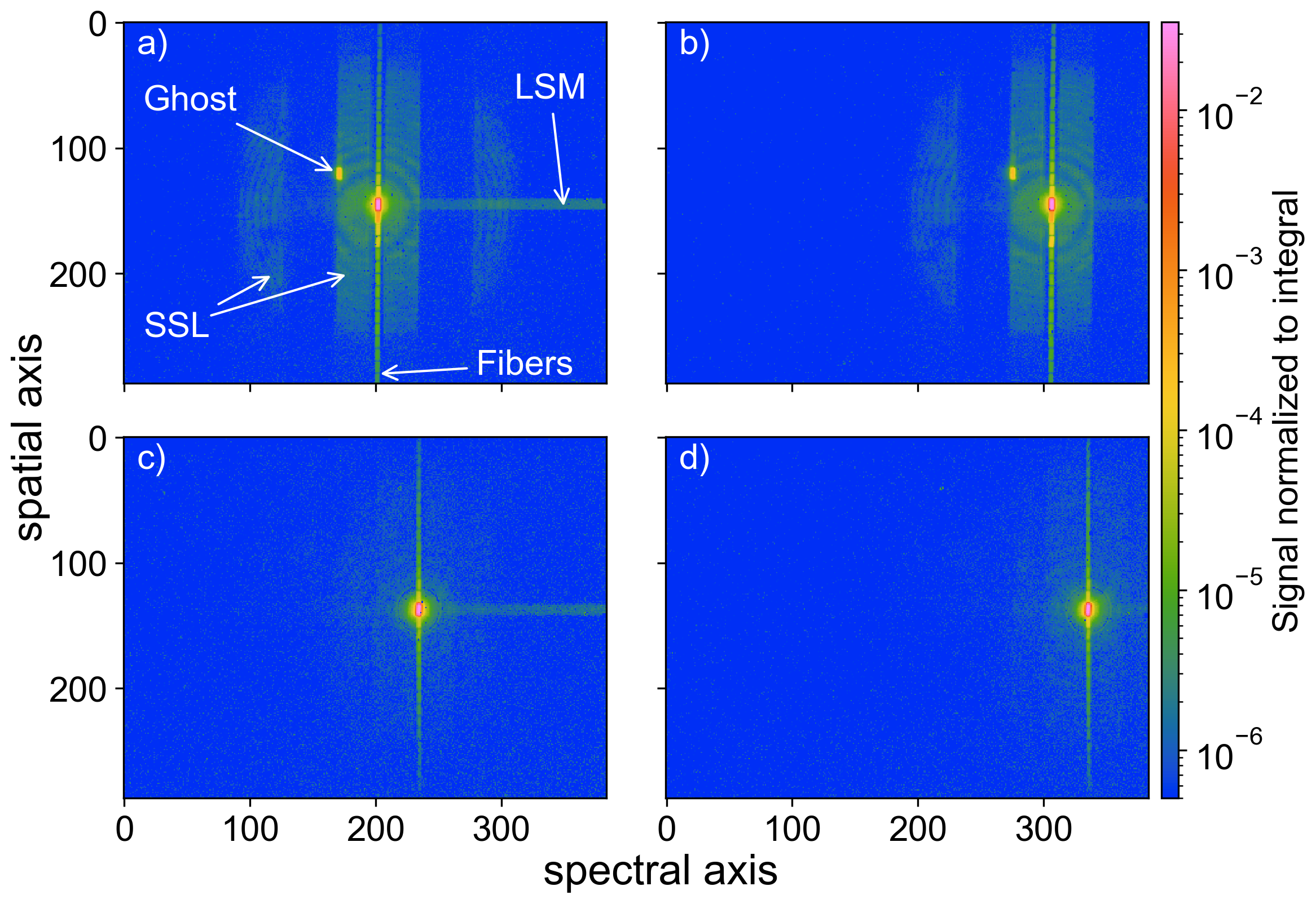 Figure 6Different spectral and spatial spots from the stray light characterization of MAMAP2D-Light in the CoMet 2.0 configuration. Panels (a) and (c) were recorded at ∼ 1628 nm, (b) and (d) at ∼ 1663 nm. The horizontal line at the right-hand side of the illuminated spot is due to the not completely suppressed laser side modes (LSM) of the laser used. The vertical line through the illuminated spots is caused by light from outside the instrument entering the spectrometer through the fibers. A sharp ghost appears spatially mirrored but spectrally in a constant offset from the initial spot. Further, the spectral and spatial invariant stray light (stable stray light; SSL) cone around the illuminated spot is shown in all images.