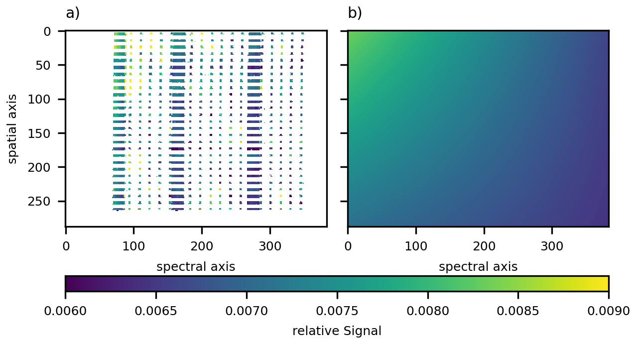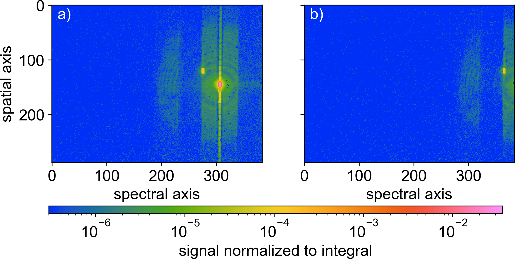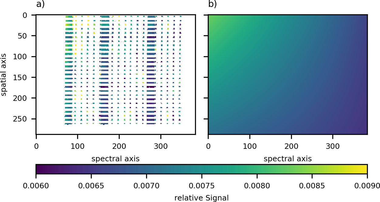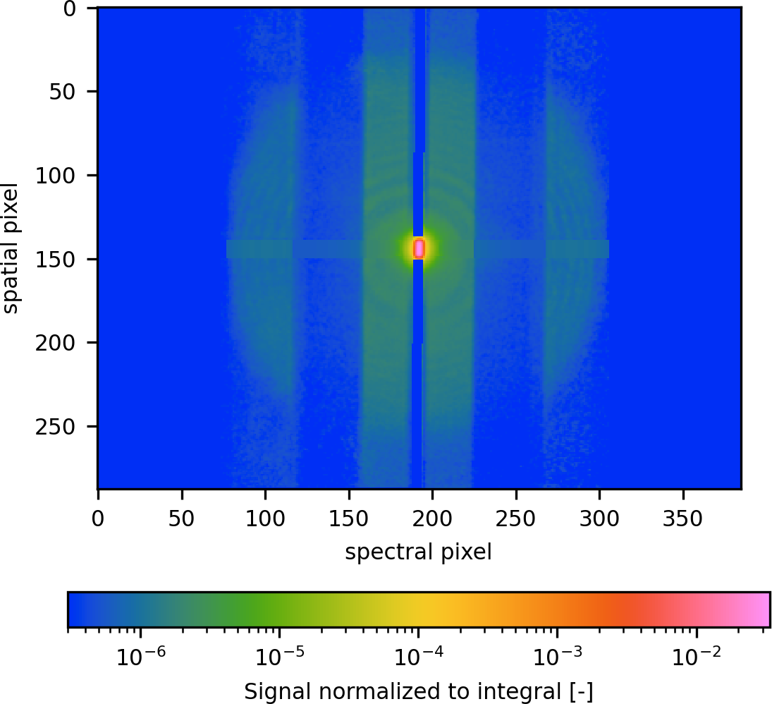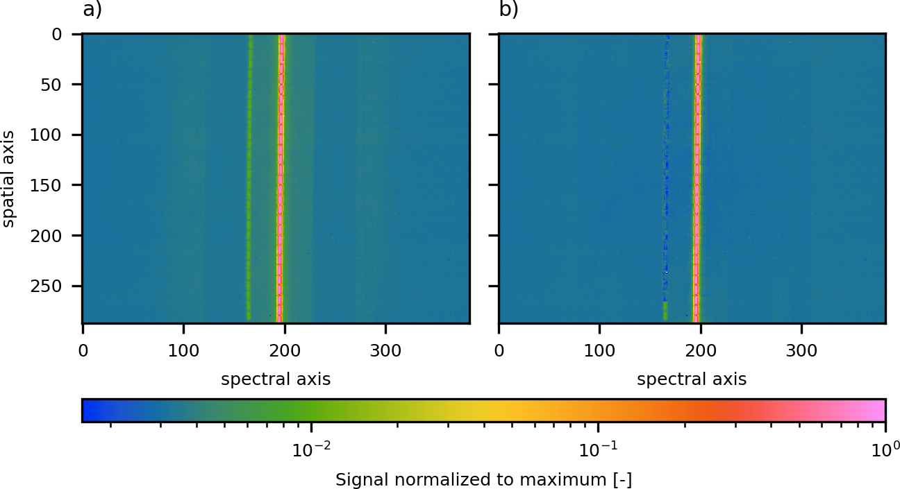 The measured stray light in Fig. 6 in Sect. 3.1 shows contamination of the used laser, which is related to insufficient side-mode suppression. For the stable kernel creation, shown in Fig. B1, those areas were corrected. Therefore, the horizontal signal of the raw stable kernel was masked. Afterward, the stable kernel was defined in several sections, depending on the surface type in the entrance slit object plane. The stray light in the outer regions from spectral pixels 75–116 and 267–303 was reflected from a steel surface from the uncoated adjustable slit aperture. Within the areas from spectral pixel 117–158 and 225–268, the light was reflected from the blade edges; due to the angle, the light was not reflected into the optical path of the useful signal. The area from the spectral pixel 159–224 was reflected from the aluminum ferrule and the aligned fibers. The stray light signal from the relay optics used for single fiber illumination can not be separated into instrumental and non-instrumental stray light, and therefore, the fiber area was set to zero.