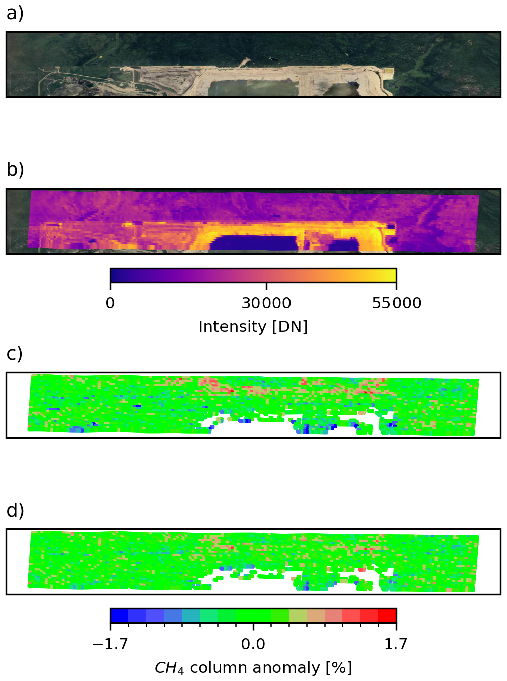 Initial results of the CoMet 2.0 campaign dataset revealed an error pattern in the proxy-corrected CH4 column anomalies for the scene shown in Fig. 9. The data was processed using the retrieval, RTM, and orthorectification parameters shown in Table G2. In the non-stray-light-corrected concentration map in Fig. 9c, significantly enhanced CH4 column anomalies are shown. The intensity map in Fig. 9b revealed a high contrast scene, where the surfaces consist of highly reflective sand, low-reflective vegetation, and a nearly non-reflective lake. The CH4 column anomaly pattern resembles the mirrored sand surface, which aligns with the mirrored ghost seen in Fig. 6. After the stray light correction, the structures in the CH4 column anomalies were reduced, but not erased. This is related to the not accurately known reflection intensity distribution Erefl shown in Fig. B2 and discussed in Appendix B2.