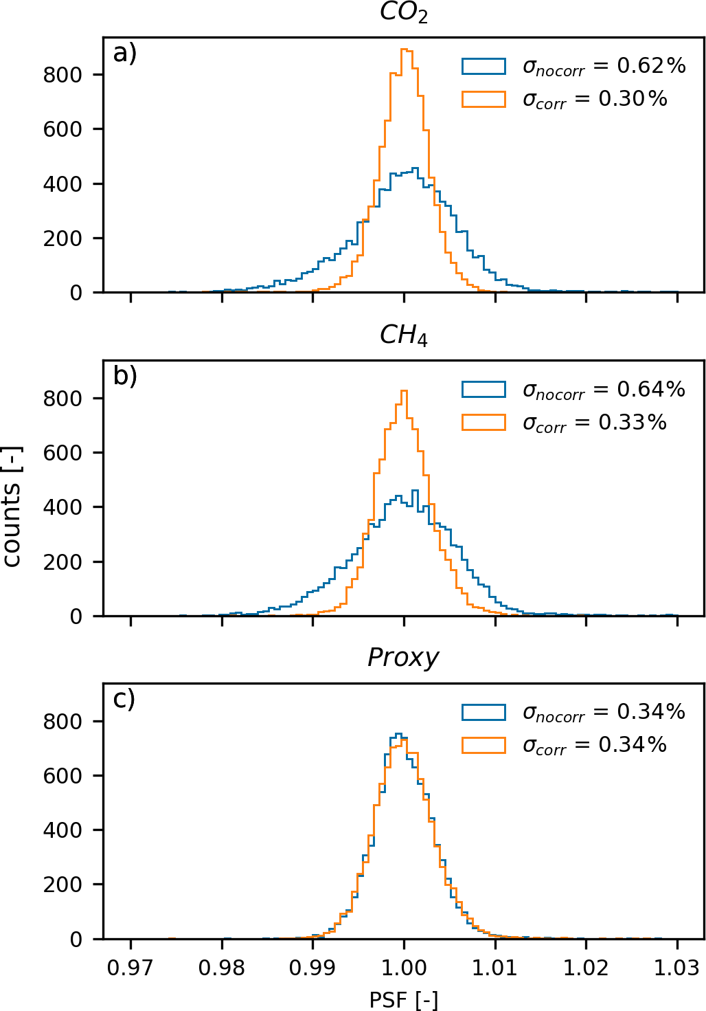 Figure 12Histograms of the retrieved single CO2 (a) and CH4 (b) and the proxy () corrected (c) column data as profile scaling factors (PSFs). The Distributions show data without (blue) and with (orange) stray light correction.