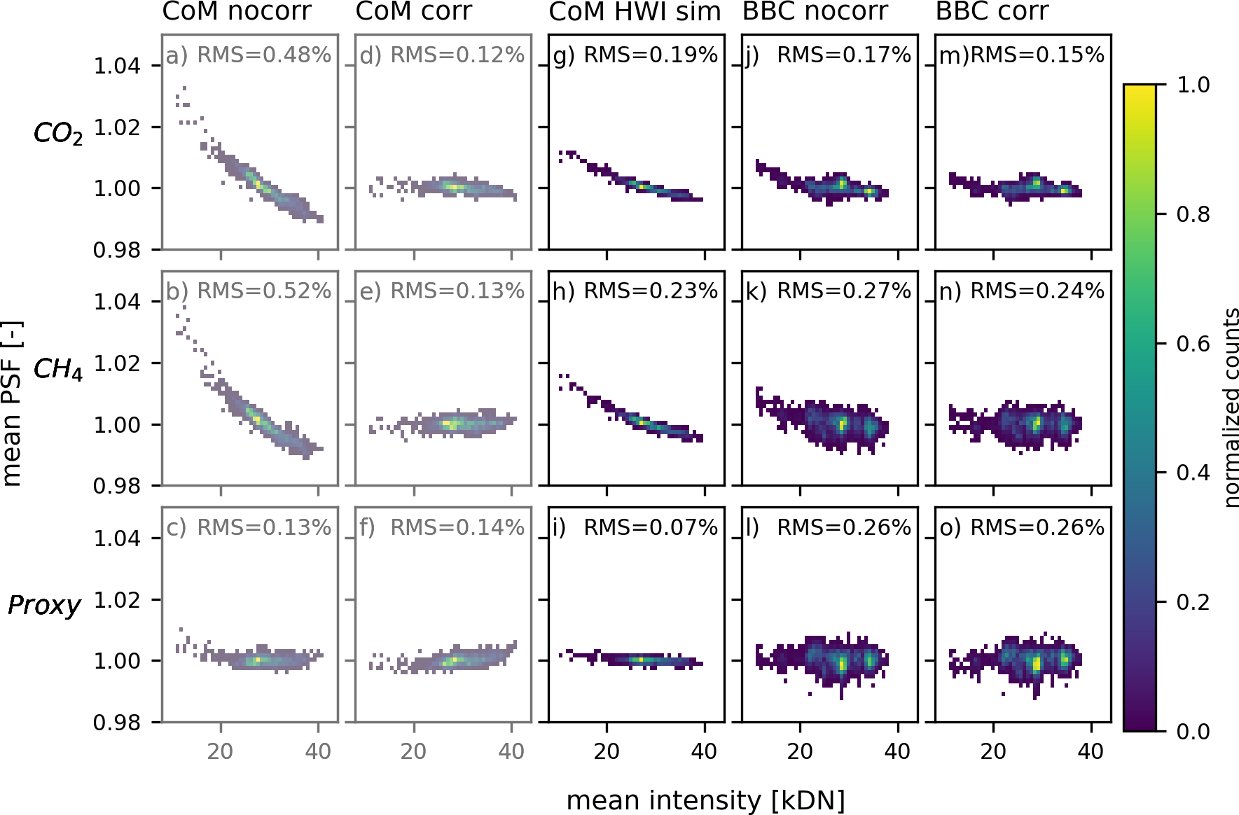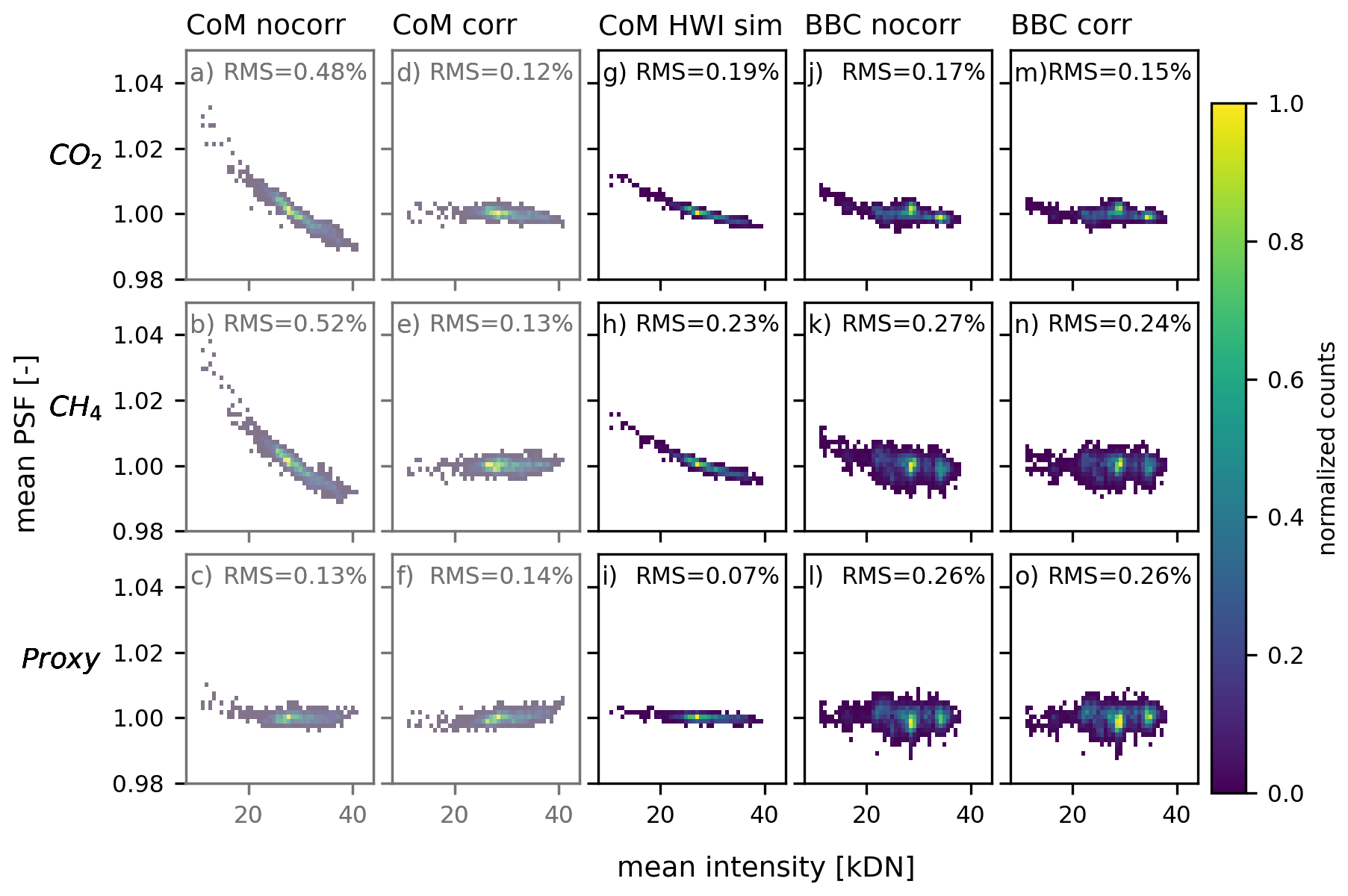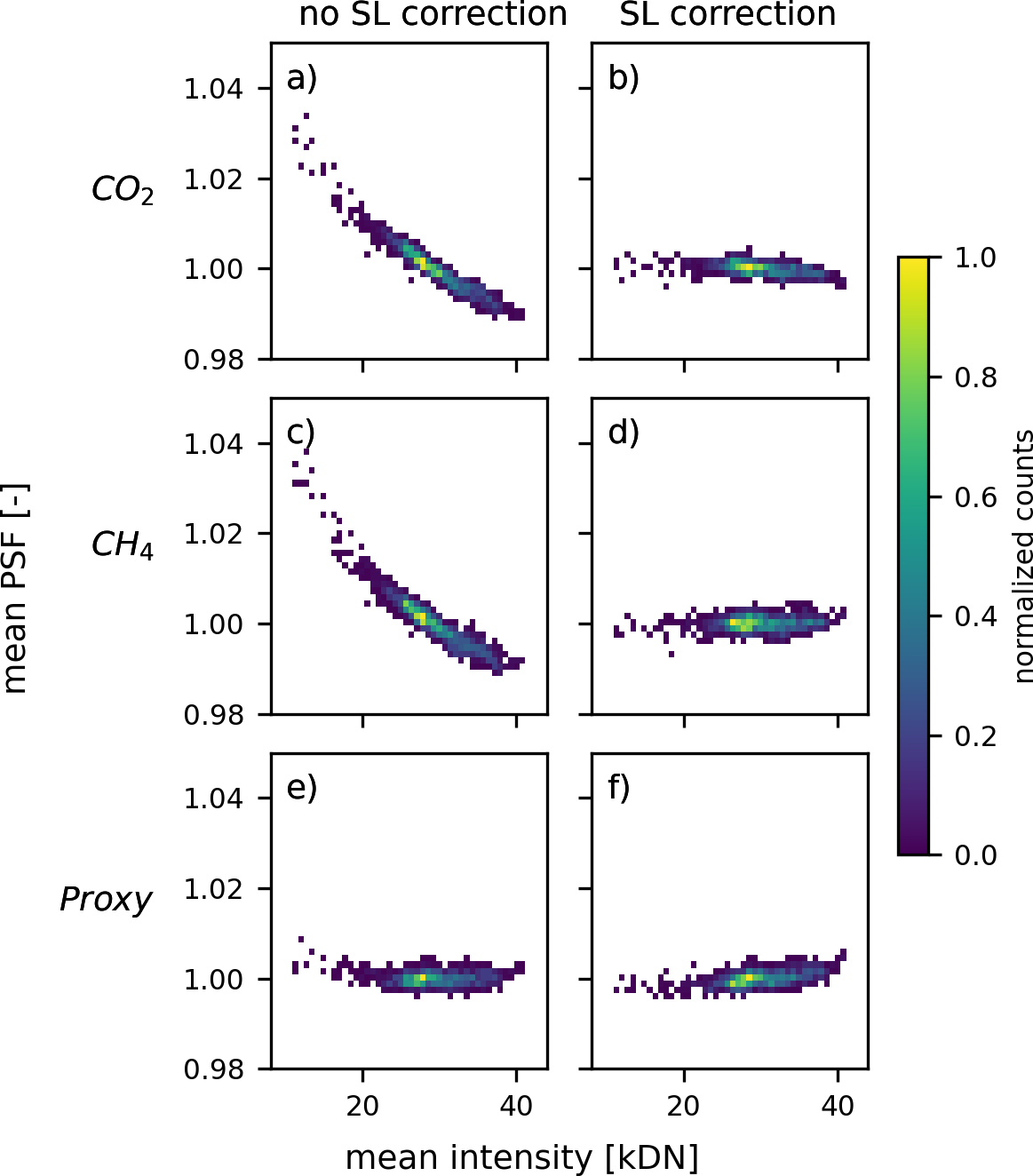 Figure 132D-histograms (color) of the average retrieved single CO2 and CH4 and the proxy () corrected column data dependent on the profile scaling factors per frame on the y axis and the average intensity of the frame on the x axis. (a) Mean CO2 PSF with no applied stray light (SL) correction shows a strong correlation with the mean intensity. After the stray light correction in panel (b), the correlation vanishes. The correlation is also visible in the mean CH4 PSF data in panel (c) and vanishes after the stray light correction (d). Panels (e) and (f) show the correlation for the proxy-corrected data, where the stray light correction has only a minor impact compared to the single columns.