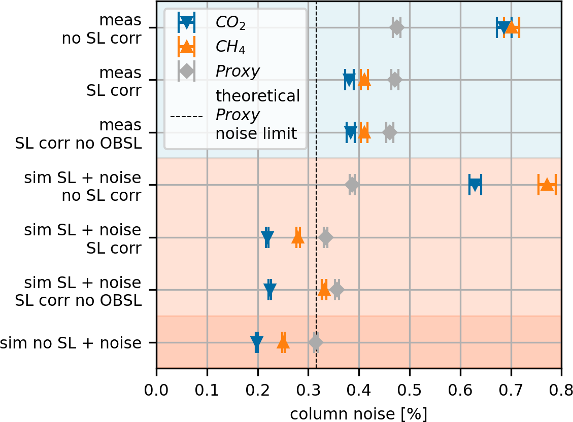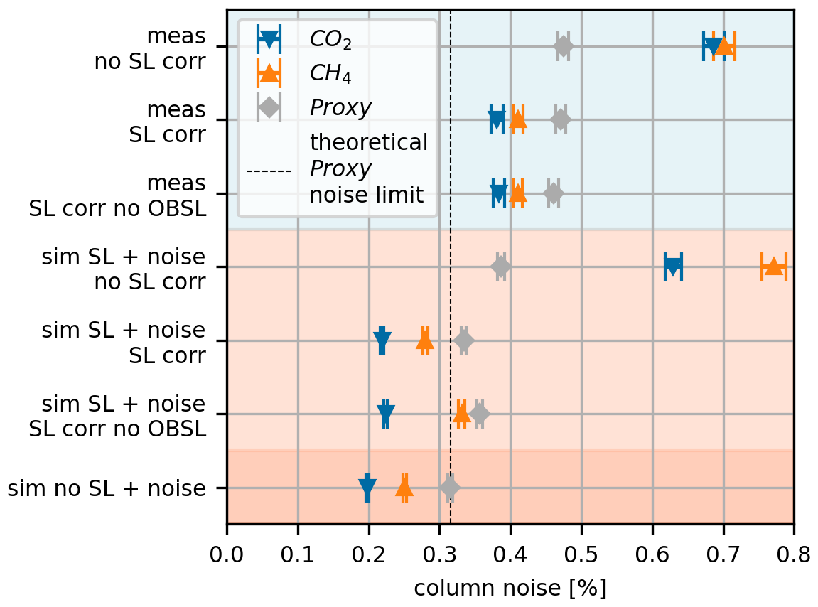 Figure 14Single read-out column noise for retrieved column anomalies for the CO2 (blue triangle), CH4 (orange triangle), and the proxy corrected () (grey diamond) column, for different cases (y axis). The cases are labeled in two lines: the first line contains the data setup with measured (meas, blueish background) or simulated (sim, redish backgrounds) spectra and the type of contamination, which is stray light (SL) and random noise (noise). The bottom line of each label indexes the case of applied correction (corr), which is (no) stray light (SL) corrected, and the consideration of OBSL in the correction.