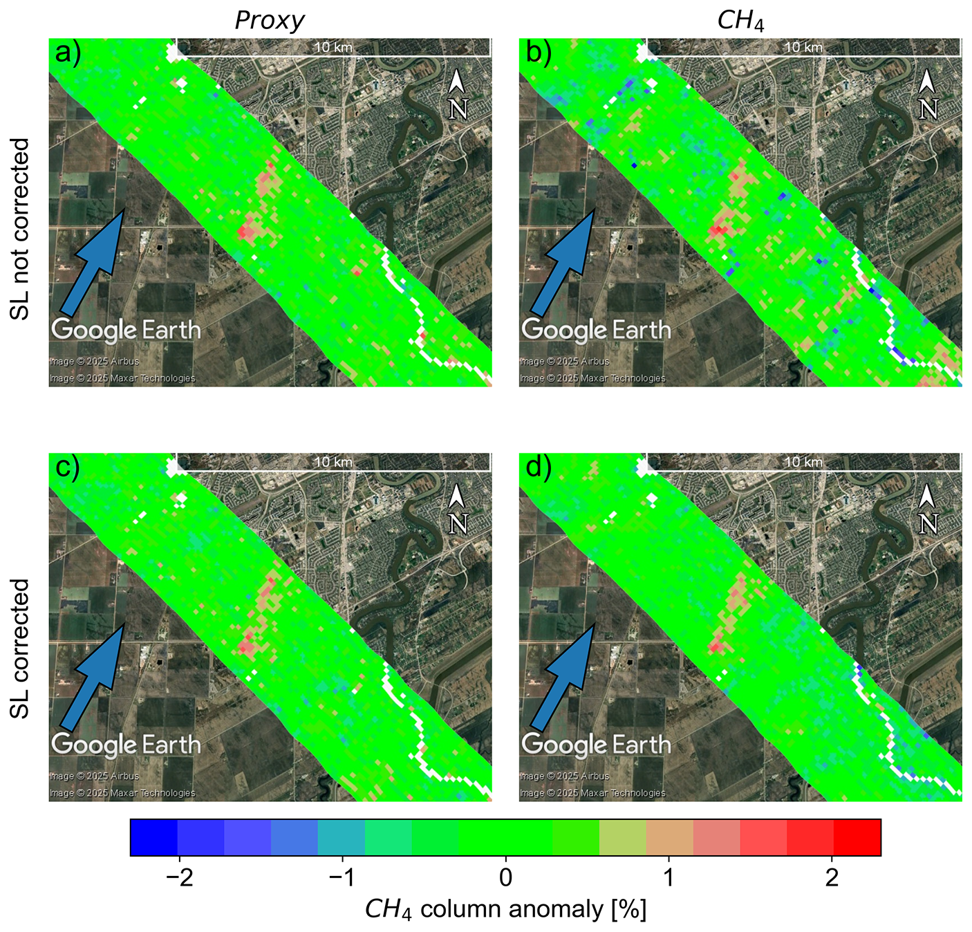 Figure 11Retrieved CH4 anomalies at the Brady Road Landfill. The results with applied proxy correction () are shown in the left column, and the single CH4 column results are shown in the right column. Non-stray-light-corrected results are shown in the top row, and stray-light-corrected results in the bottom row. The blue arrow indicates the wind direction. The map underneath is provided by Google Earth (Image © 2025 Airbus, Image © 2025 Maxar Technologies).