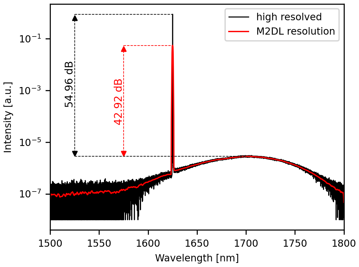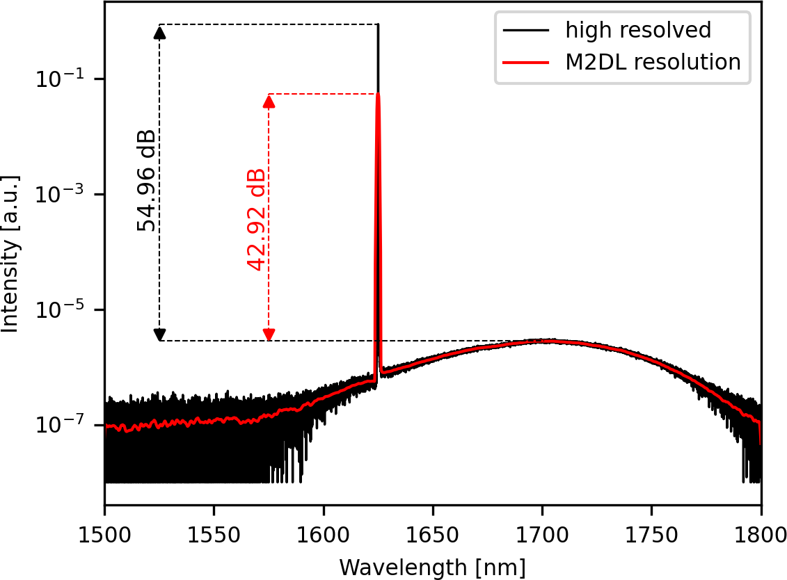 The optical setup for the stray light characterization measurements is shown in Fig. 4. A Littman/Metcalf laser system (Sacher Germany, Lion System, Stry et al., 2006), with a tunable wavelength range from 1600–1750 nm at a movement precision of 0.05 nm and a power of ∼ 20 mW was used as a tunable monochromatic light source. The laser diode's side modes are suppressed by the Littman/Metcalf configuration, which is wavelength-dependent. The manufacturer determined the side-mode suppression for several wavelengths. As an example, it is 55.4 dB at 1625 nm, measured with a spectral resolution of 0.05 nm, see Fig. C1.