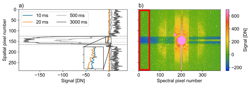 The stray light was quantified at 21 positions across the FPA (3-4 spectral at six spatial positions). At each position, 100 frames at 10 different exposure times were recorded. The exposure times were increased from 10 to 3000 ms to increase the dynamic range of the measured signal. The PRF area of MAMAP2D-Light is larger than in the TROPOMI SWIR spectral band, leading to larger areas of saturation during the stray light characterization, surrounded by a 1-pixel wide area of blooming1 around the saturated pixels. To obtain reliable data in the saturation area, the exposure time was increased in specifically adapted, smaller steps. The dark signal level, increasing linearly with the exposure time due to thermal radiation, constrained the highest exposure time to 3000 ms. The dark signal for each point was measured for each exposure time after a complete set of exposure times with illumination by shutting off the laser. The measurements were flat-field corrected, where the fibers' cladding areas (displayed as dark lines in the spectral direction in Fig. E1) were interpolated by fitting a 2-dimensional 3rd-order polynomial to the fiber core signal. The dark current corrected data showed patterns related to a detector effect, which were most prominent for higher exposure times with increased saturation. The patterns were corrected using a data-driven approach, which is shown in detail in Appendix D.