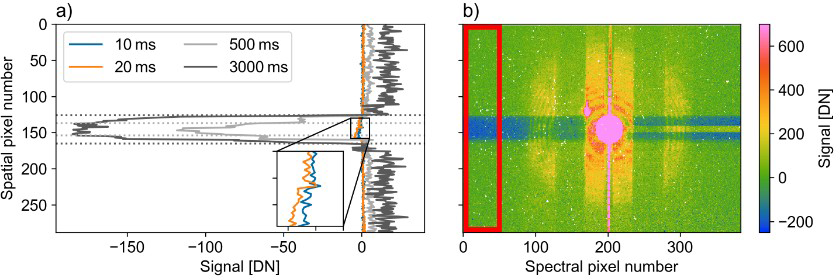 The stray light correction was applied to a laser measurement with a fully illuminated entrance slit at a given wavelength. The measurement was dark current and flat-field corrected. Furthermore, the bad pixels were linearly interpolated prior to correction. The measured and the corrected frame are shown in Fig. 8. The ghost is visible as a dashed line left from the laser signal in the measured frame. In the correction, the shade from the stable stray light vanishes nearly completely. The intensity of the ghost is decreased, and at some pixels, it is overcorrected. Due to the spatial shift of the reflected stray light (xrefl in Appendix B2), the lower two fibers of the ghost are not corrected. The standard deviation (SD) of the measurement, representing the residual noise after correction, is derived by excluding the entrance slit (i.e., direct signal) area. The stray light correction reduces the measured standard deviation SD(Smeas) = 0.060 % to SD(Scorr) = 0.025 %.