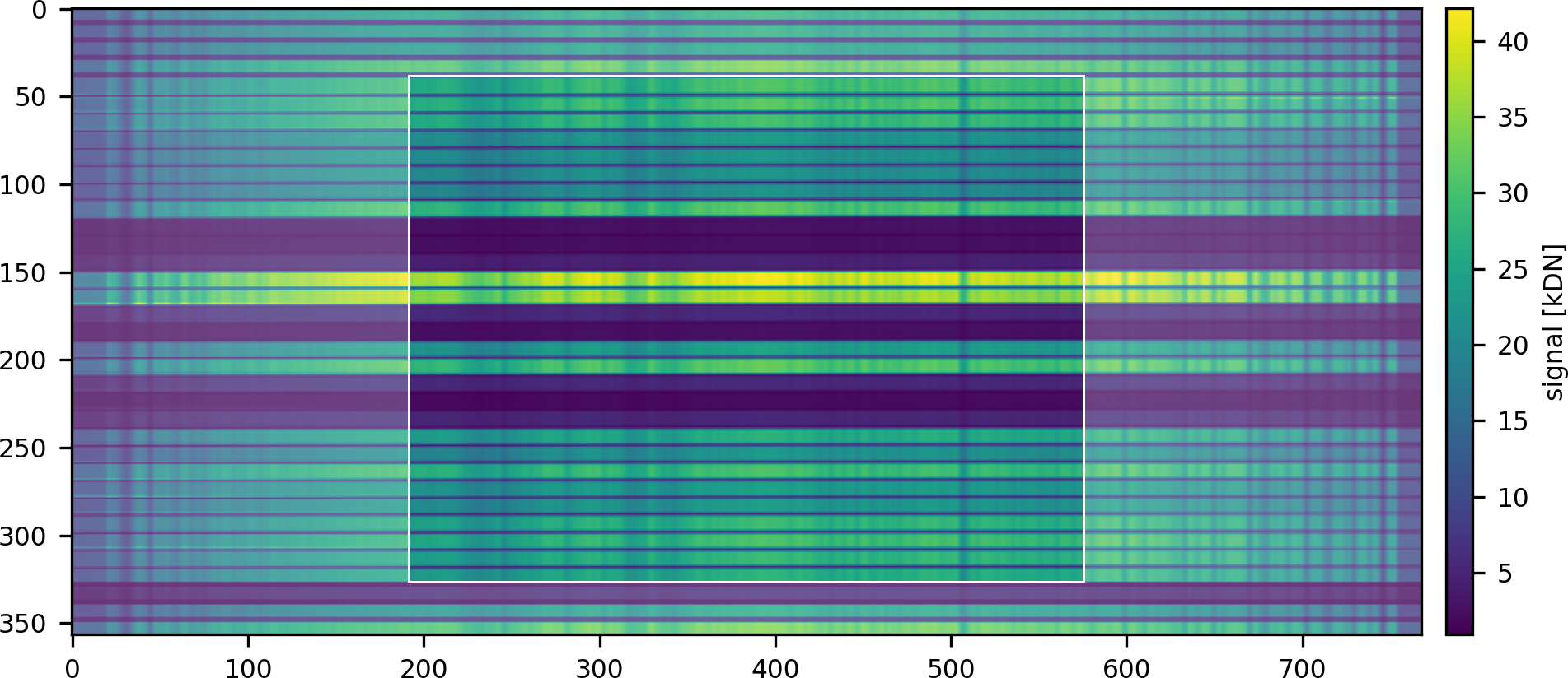 Figure E1A generated synthetic frame with the fiber structure of MAMAP2D-Light. The highlighted middle represents the dimensions of the MAMAP2D-Light detector. The pale surrounding is the out-of-field signal, which contributes to the corresponding stray light error signal based on the stray light kernel.