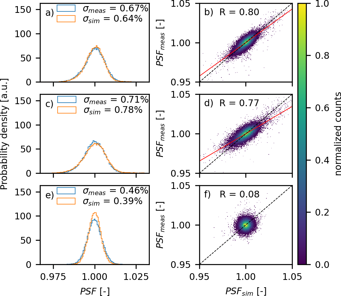 Figure E3Retrieved profile scaling factors (PSF) for the CO2 (a, b), CH4 (c, d) and the proxy corrected () (e, f) columns for simulated and measured data. The simulated data is artificially contaminated with stray light and random noise. The left column shows histograms representing the column noise. The right column shows the correlation of the simulated and measured column anomalies. The red line shows a linear fit throug the data, and the dashed black line marks a Pearson correlation coefficient (R) of one.