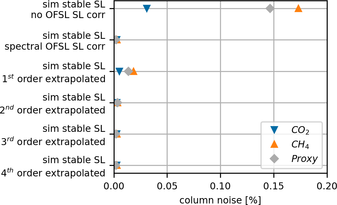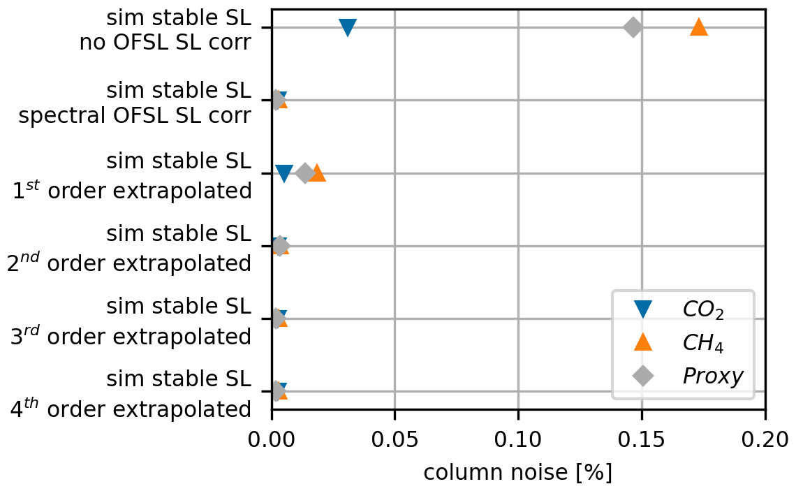 In the simulated spectra, the OFSL is randomly added but not considered in the correction. When comparing the stray light corrected case with the noise-only contaminated case, the leftover OFSL increases the column noise by 7.1 % in the proxy corrected column and 9.1 % and 10.7 % for the single CH4 and CO2 column.