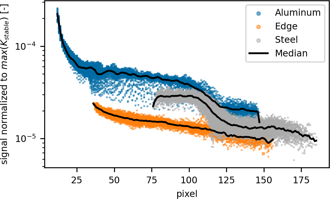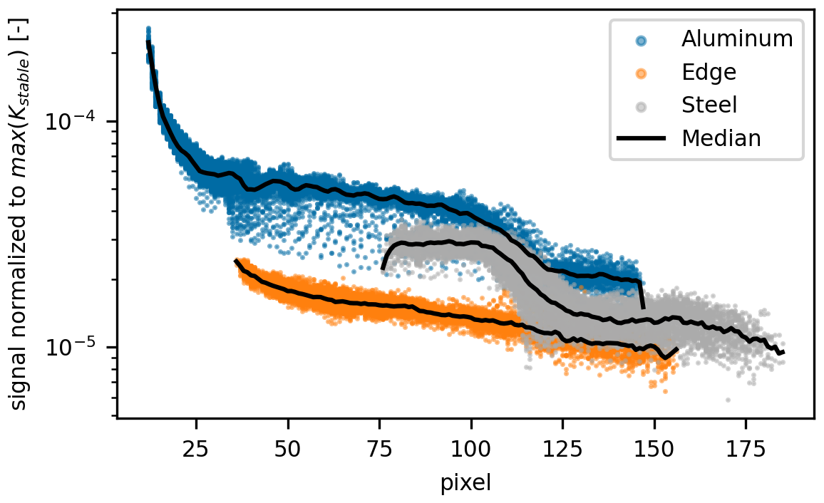 The signal of each region was remapped into the polar coordinate space using “warp_polar” function of the “skimage” Python package (version 0.18.1). The rows of the resulting 2D image represented the rotation angles, and the columns the radii. The signal in dependency of the radius for all angles is shown in Fig. F1. At this point, a generalized scattering theory, such as the Harvey scatter model described by Peterson (2004), could be fitted. However, due to the signal steps in the aluminum and steel areas, the fitting did not describe the kernel sufficiently. Therefore, the median value along the rotation angle axis was used as a numerical function to describe the scattering. By rotating the function, the observational gaps were filled.