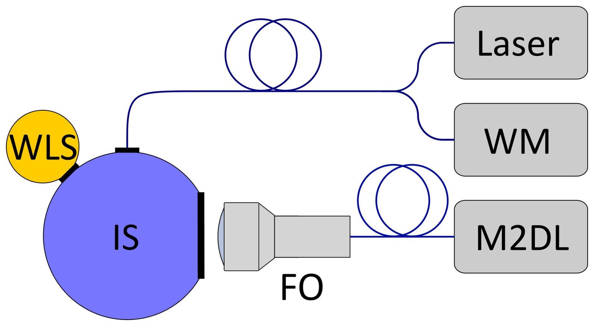 Figure I1Optical setup for characterization measurements. Tuneable Littman/Metcalf laser observed with a Wavemeter (WM) and led via a fiber to an integrating sphere (IS). The second input port of the integrating sphere is occupied by a white light source (WLS). The front optic (FO) of MAMAP2D-Light (M2DL) views the output port of the sphere.