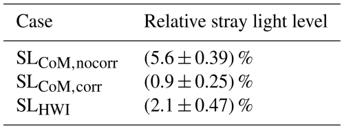The stray light characterization measurements following the CoMet 2.0 mission revealed the presence of a significant amount of stray light, ∼ 5.6 %. Consequently, a post-flight stray light correction was implemented based on the procedure described by Tol et al. (2018) for the stable and reflected stray light utilizing the characterization measurements outlined in Sect. 3.1. The corrections of the different stray light contributors are described in detail in Appendix B. Furthermore, in this work, an approach for the correction of out-of-band stray light (OBSL) was developed and applied.