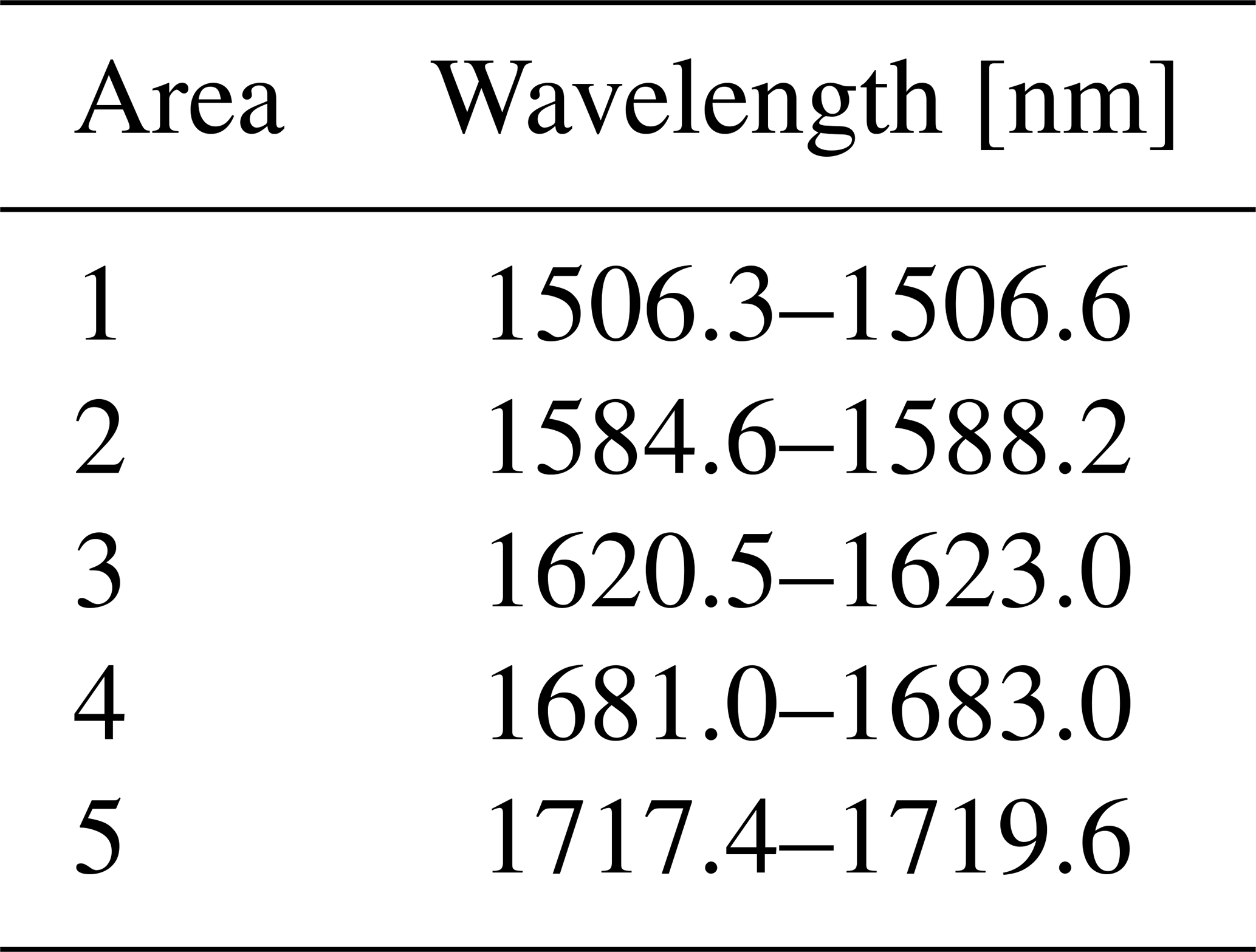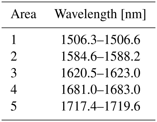 For generating the synthetic frame, the slowly varying curve related to the spectral surface reflectance and aerosol scenario of the spectra had to be taken into account (Fig. E2). In the WFM-DOAS retrieval, this was done by fitting a low-order polynomial Pλ(a) (Sect. 4.1). For the synthetic frames, the calculated RTM was first flattened and then rescaled with the curve of the measured spectra. The slowly varying curve in the radiance of the RTM and the measured spectra was determined by fitting exp (Pλ(a)) to the mean value of several areas with minor absorption-band features in the spectra, see Table E1. For the calculated RTM, all five areas were used for the fit. The measured spectra were limited to the spectral range of MAMAP2D-Light. Therefore, only the values from area 2 to area 4 could be used. The wavelength for the measured data was used from the wavelength grid described in Appendix I1. The retrieval fit window was chosen to keep the requirement for the retrieved PSFs equal to one.