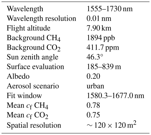 The analysis was based on synthetic spectra, as they would be measured by MAMAP2D-Light, with known atmospheric properties. For simplification, the same RTM and instrumental spectral properties, ISRF, and wavelength grid were used for the synthetic spectra and the retrieval. Therefore, retrieving the synthetic spectra without any error signal contamination results in profile scaling factors (PSFs) equal to one. To consider the OBSL, the RTM was calculated for the wider wavelength range of 1500–1750 nm compared to the wavelength range of approximately 1559–1689 nm imaged at the MAMAP2D-Light detector. The range was chosen due to the size of the stable stray light kernel in Fig. B1. The RTM was convolved with the measured ISRF of the instrument.