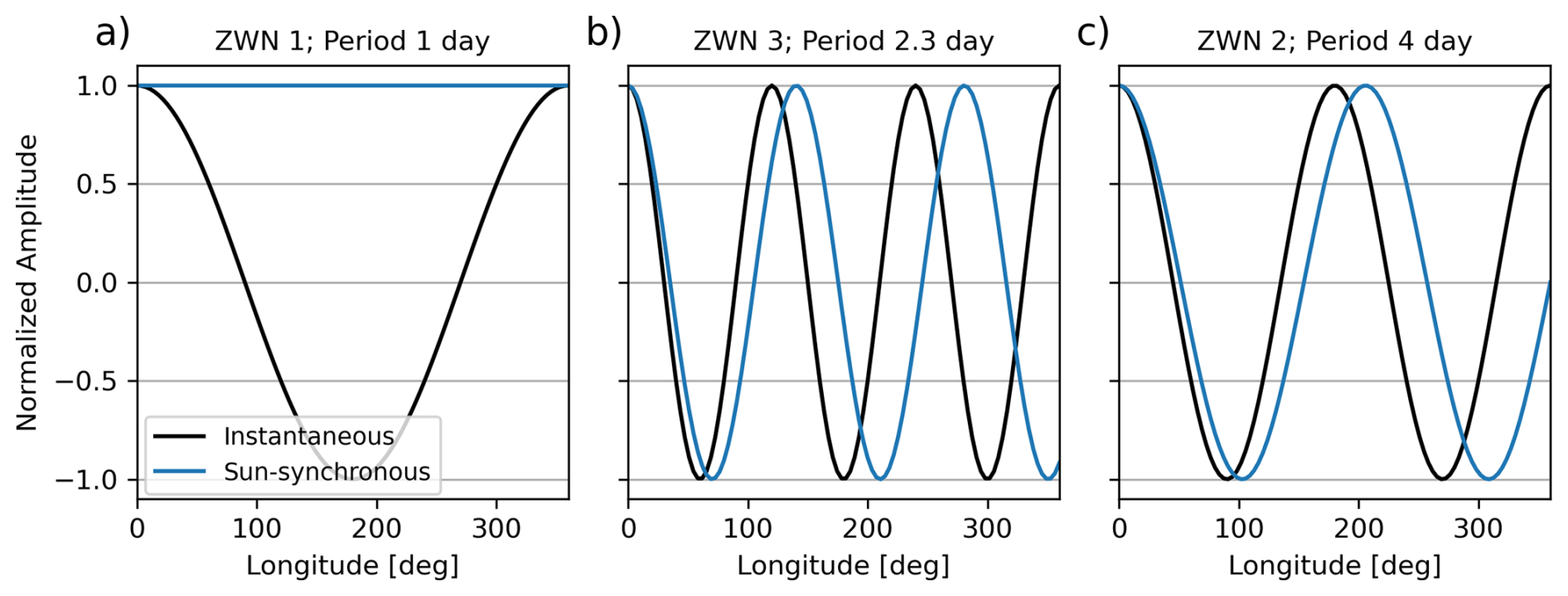 Figure 1Sampling of global-scale waves from a sun-synchronous orbit for (a) DW1 solar tide (e.g. Oberheide et al., 2000), (b) quasi-two-day wave (e.g. Ern et al., 2013) and (c) a fast Rossby-wave mode (e.g. Salby, 1984). Black is the actual wave at t=0 and blue is the observed perturbation from the moving instrument accounting only for a single (e.g. ascending) orbit direction. Descending orbits would observe the system phase shifted depending on latitude.