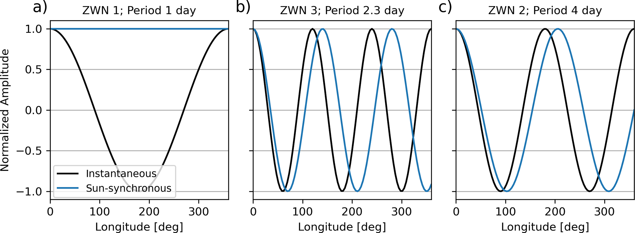 Another subtlety to consider is that satellites are not measuring a whole latitude circle at a fixed time but time evolves as the orbit precesses. Some of the global wave modes, the quasi-stationary planetary waves (PWs), have such long periods (i.e. small ω) that the time difference between observations does not matter, but there are other prominent wave modes with temperature amplitudes of the order of tens of Kelvin, which have much shorter periods. The shortest periods are those of the solar tides, which are 24 h (diurnal tide), 12 h (semi-diurnal tide), or even shorter. Predominantly, these wave modes are excited by heating due to solar radiance absorption in several layers of the atmosphere, which leads to the most prominent modes to follow the position of the sun. Considering longer periods, there is a sufficient number of Eigenmodes to allow almost any ground-based period between 2 and 30 d (or even longer). A brief illustration of the effect of the limited sampling of satellite observations (Salby, 1982) is given in Fig. 1 by comparing the instantaneous wave pattern seen at a fixed time to the corresponding observations A(λ,t) obtained when the observations are performed by a sun-synchronous satellite.