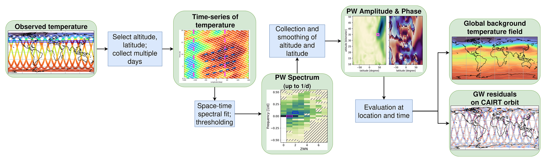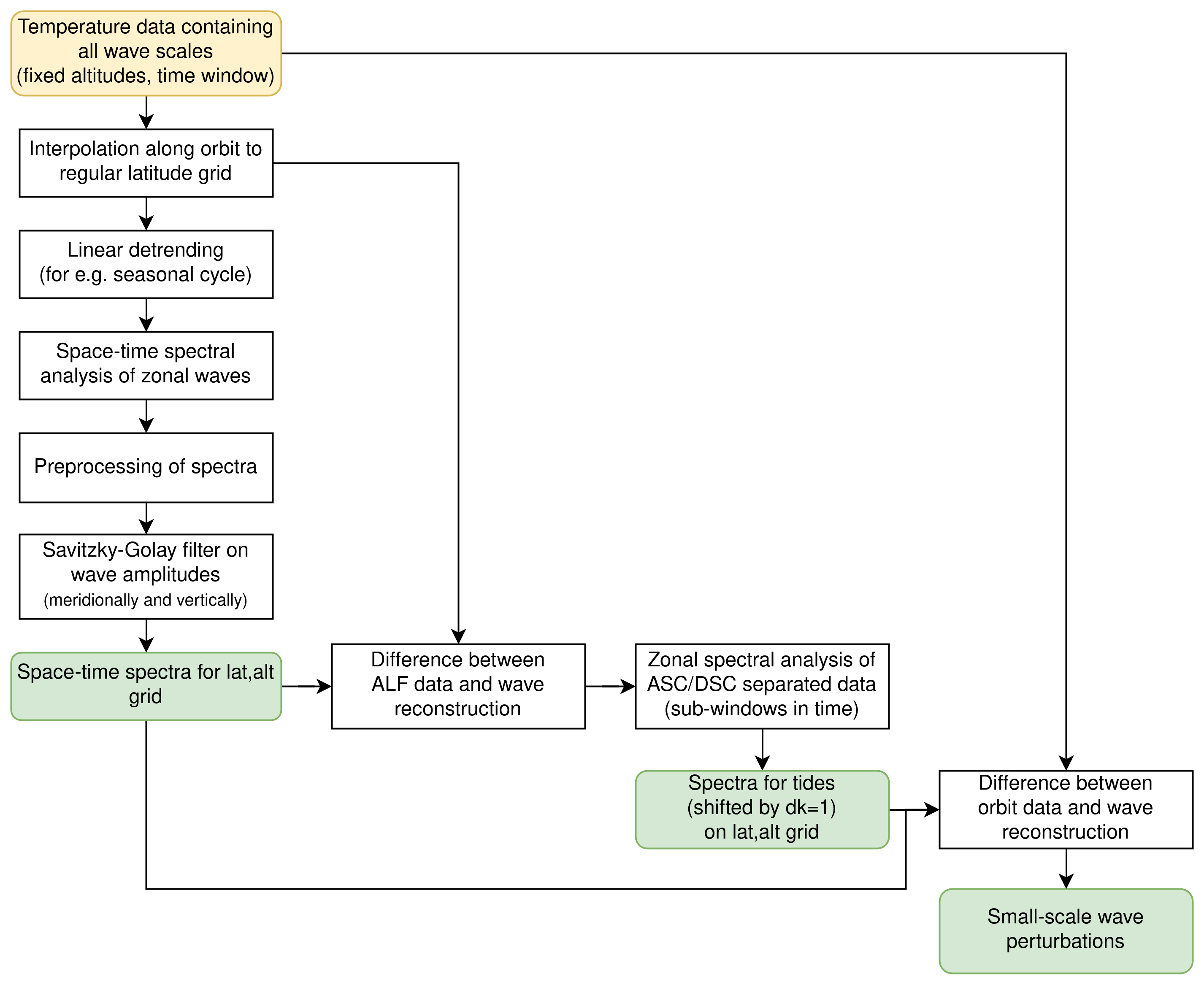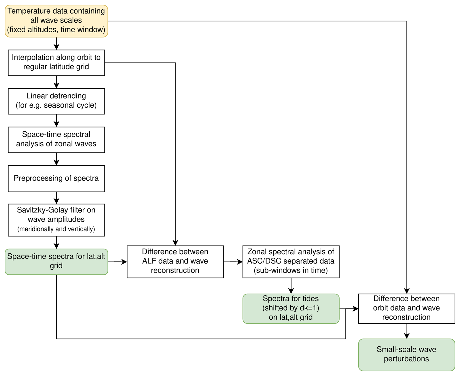 The resulting PW spectrum obtained from the satellite observations containing only global-scale waves can then be evaluated on the initial observation grid to give a time-dependent large-scale temperature background. Subtracting this background from the full observations results in remaining temperature perturbations caused by small-scale GWs and tides. The tide removal is the aim of the next step in the processing.
