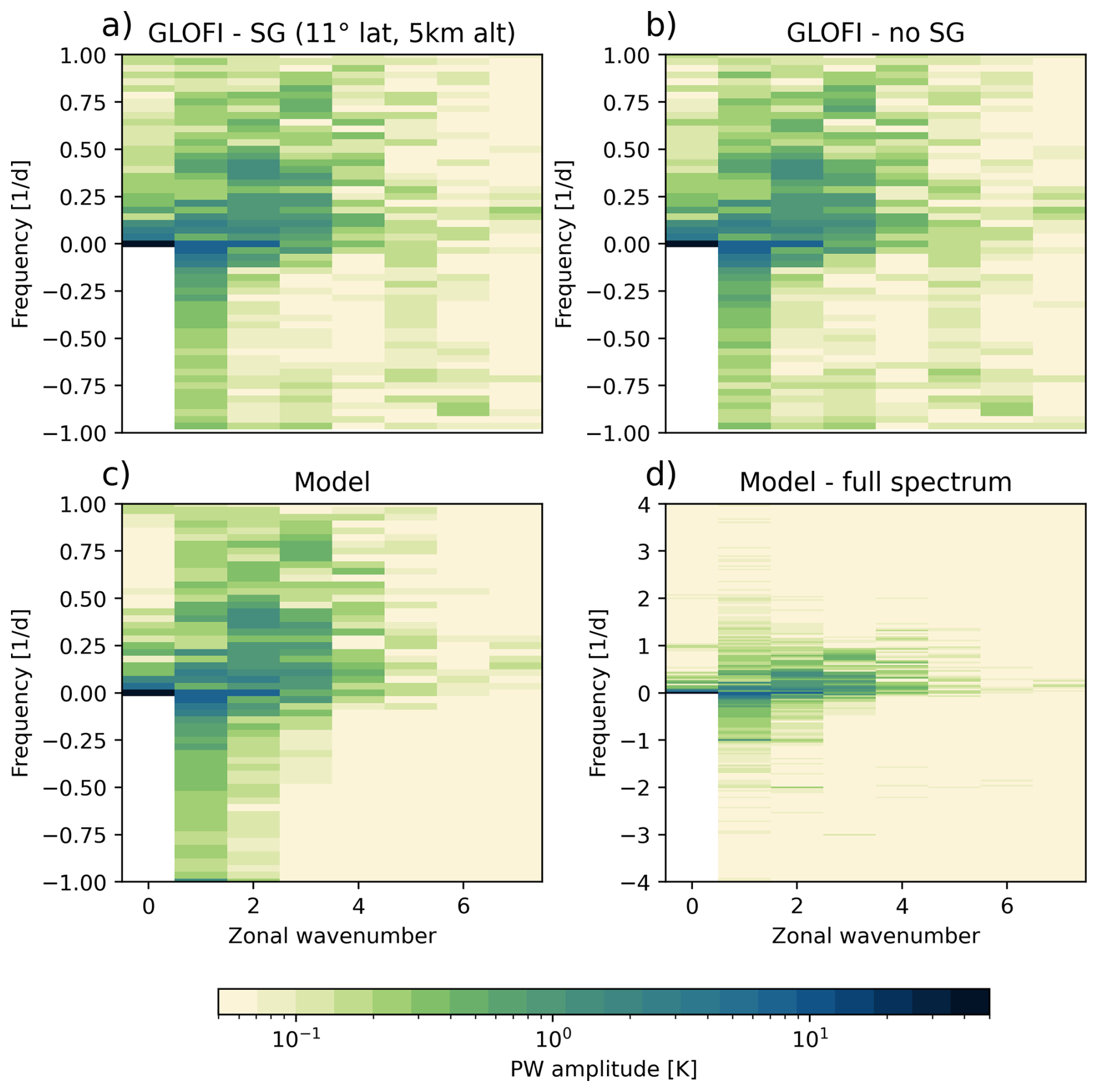Figure 4Comparison of the determined PW spectrum from the GLOFI algorithm applied to simulated satellite observations with and without Savitzky-Golay filter (a and b, respectively) and the reference spectrum calculated from the full model data in the satellite-observed frequency range (c) and the full spectrum (d). The PW spectrum of the model includes higher frequencies up to 4 cycles d−1, which cannot be inferred from the satellite observations and are (at least partially) aliased into the GLOFI spectra. The spectrum is shown for the time window of 16 January 2019 to 12 February 2019 at 40 km altitude and 60° N.