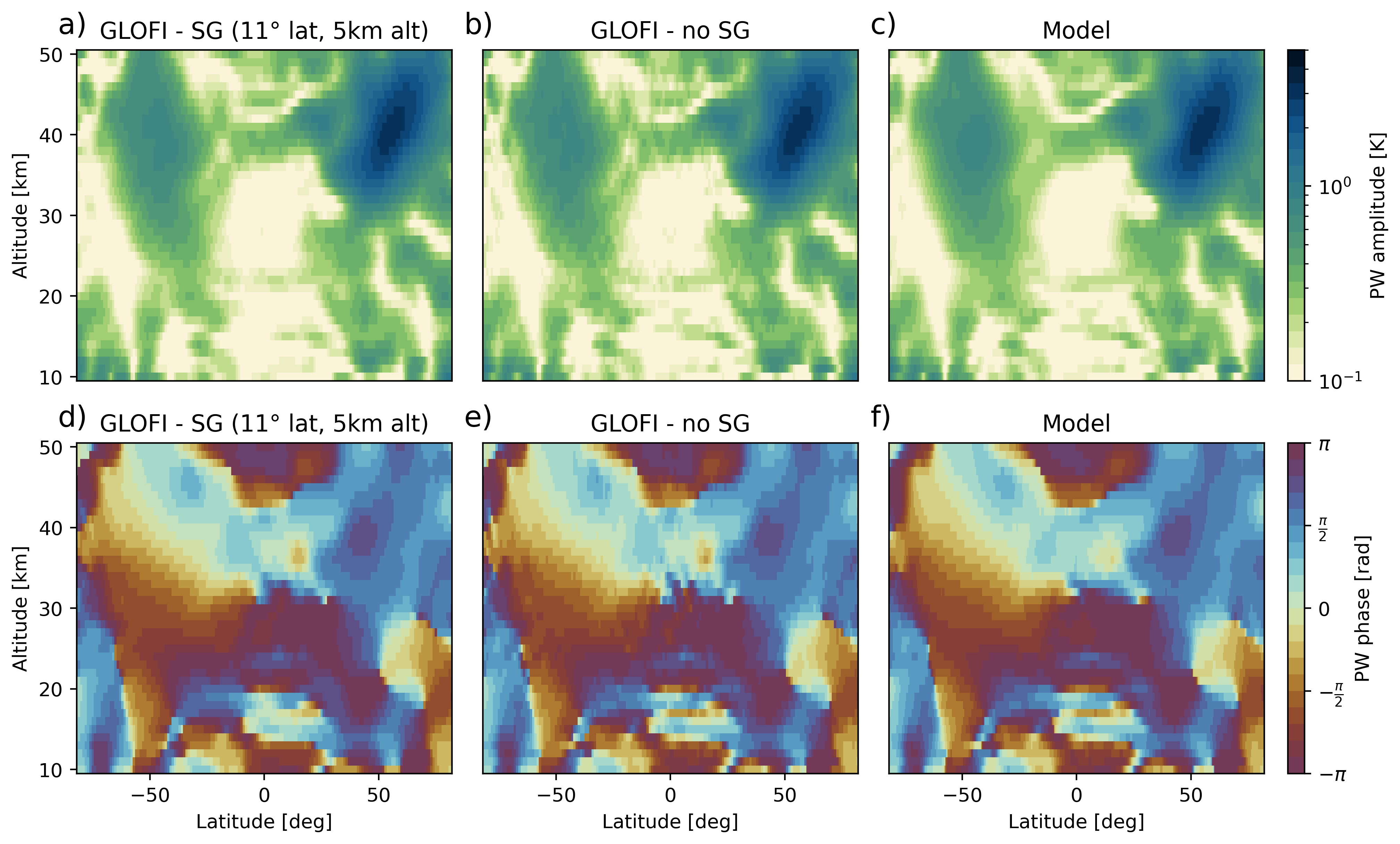 Figure 5 shows the PW amplitude and phase of a single wave mode across the whole altitude and latitude range as an example. The structure of both the amplitude and phase determined from the simulated satellite observations agree very well with the ones from the full model data. Even small-scale variations of the amplitudes are well represented in the satellite data. The GLOFI methodology finds large-scale coherent wave structures throughout the atmosphere just as present in the reference data. Applying the Savitzky-Golay filter has a rather neutral effect on the PW spectrum: some regions fit better to the model data, others minimally worse. This and the good agreement to the model data give confidence that the methodology describes the PW situation within the atmosphere realistically.