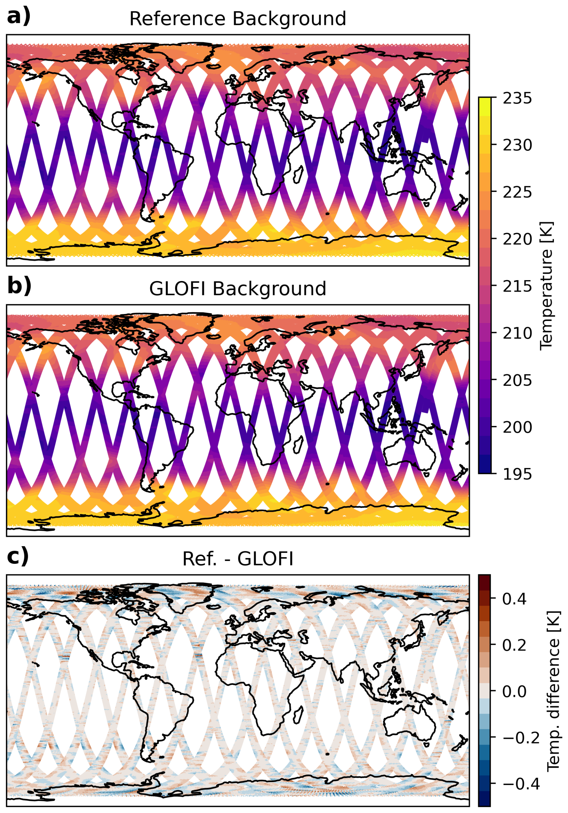 For the performance evaluation of the actual scale separation into PW background and GW perturbations, we use synthetic observations containing the simulated background as well as sampled GWs of a single model snapshot and apply the GLOFI algorithm to generate the PW and tide spectra. The resulting spectra are then used to reconstruct the large-scale temperature background at the satellite orbit coordinates. The difference between the background temperature thus obtained and the synthetic observations yields the GW perturbations on the satellite grid. A comparison of these GW perturbations to the satellite-sampled GW perturbations of the model allows the estimation of the algorithm performance for realistic observations. Figure 8 shows an example of such a comparison. The differences between the sampled reference (Fig. 8a) and GLOFI-recovered GW perturbations (Fig. 8b) is shown in Fig. 8c. The differences have a zero mean with a standard deviation of 0.02 K. The regions of higher deviations, where differences go to a maximum of 0.29 K, coincide with latitudes at which the GLOFI estimated background deviate strongest from the reference, as shown in Fig. 6c. As discussed, these show up due to to aliasing from higher frequency planetary modes.