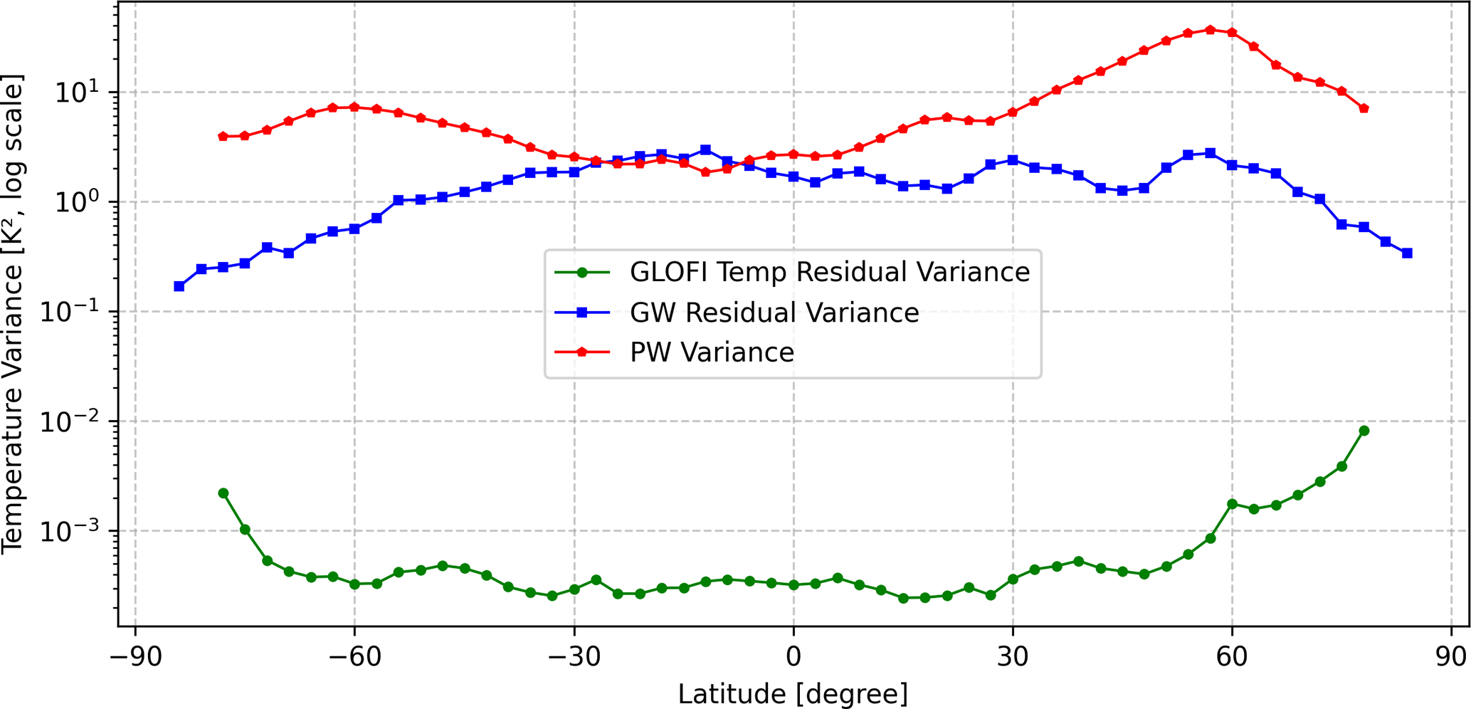 Figure 9Temperature variances of (sampled) GW perturbations, PW perturbations and remaining residuals after subtracting the GLOFI PW background from the PW residuals at different latitude points. Shown is data for 12 March 2019 at 25 km altitude.