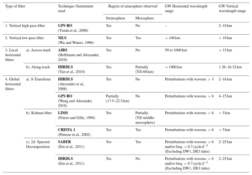 Among the zoo of different waves in the atmosphere, GWs are local wave modes existing in well-defined regions associated with their various sources, while other wave modes are global in nature. These global-scale waves interfere with the observation of GWs. The analysis of global-scale waves requires full longitudinal coverage, i.e., one or multiple days of satellite observations. Therefore, it is not straightforward to discern the perturbations due to GWs from those of global-scale waves. Appendix A presents some of the methods used in previous studies to extract these global wave modes which, along with the mean atmospheric state and seasonal trends, constitute the “background”.